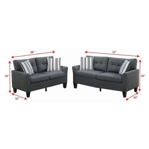 A perfect 2 piece sofa set to place in any living space will leads to a perfect furniture setting. Its construction involves the use of durable wood material comprising plywood base panel with solid pine frame draped in glossy polyfiber fabric in charcoal gray. This set comprises one loveseat and one sofa with contrasting accent pillows. Does not include table or any featured product other than one loveseat and one sofa with accent pillows.