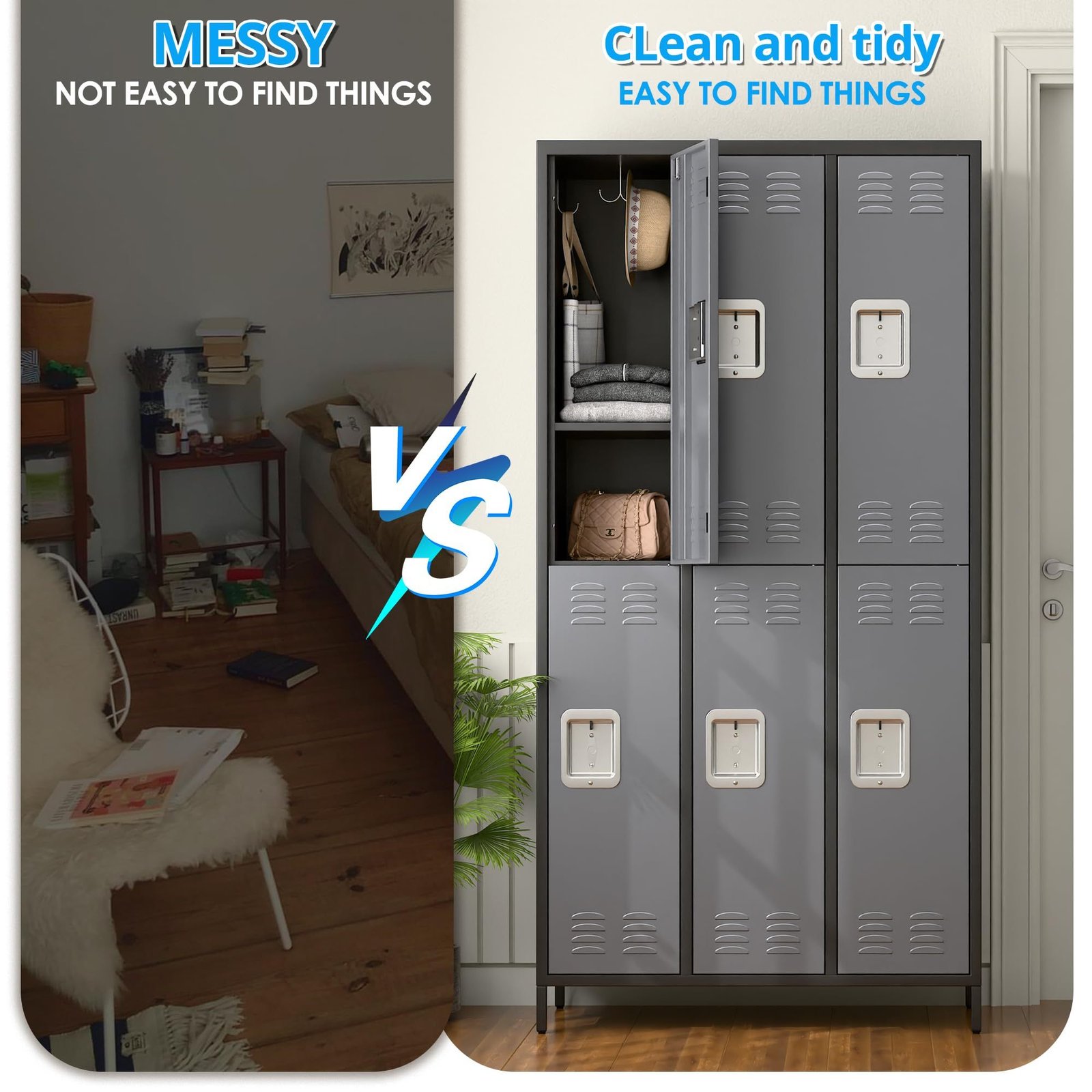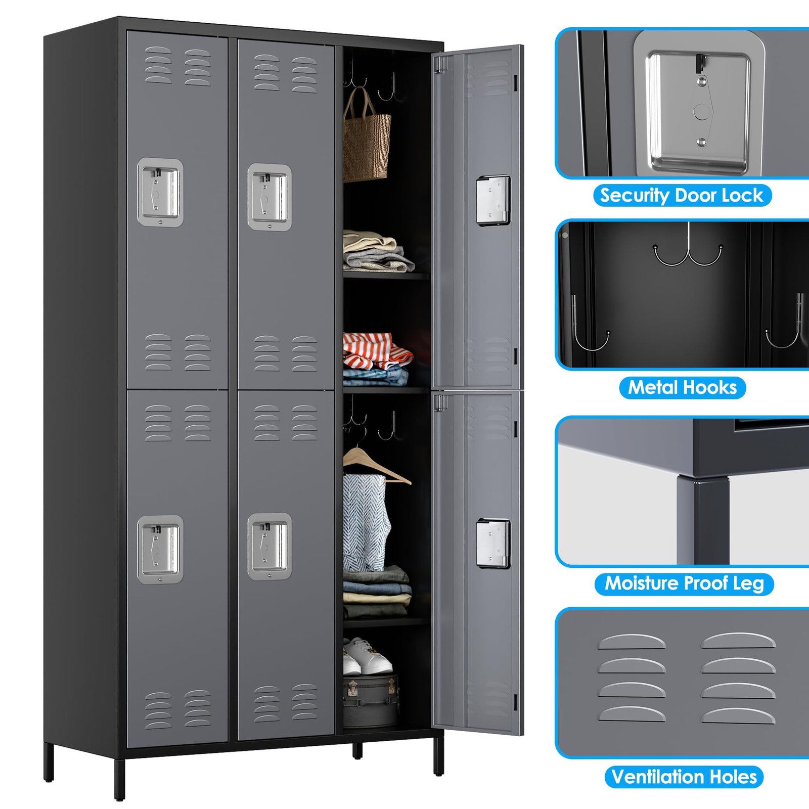 Metal Lockers For Employees,Locking Metal Storage Locker With 6 Doors &18 Hooks For School Office Gym Bedroom,Assembly Required,Black And Dark Grey