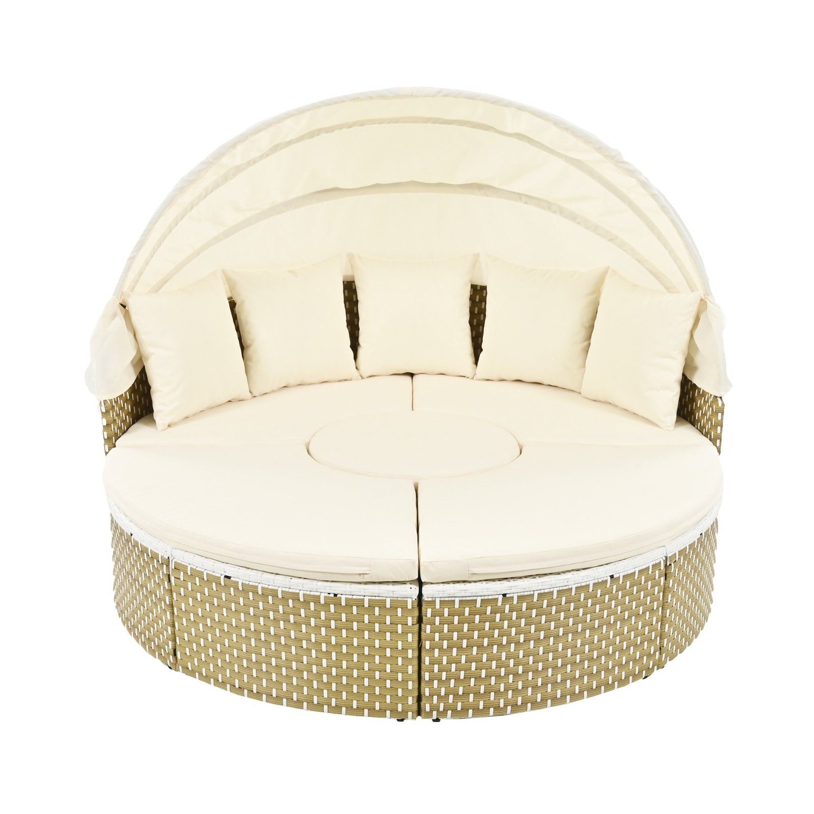 • [Versatile Comfort with a Retractable Canopy] Our round sectional sofa, which seamlessly transforms into an organized daybed, offers unparalleled versatility and comfort. The retractable canopy, easily fastened by straps, allows you to enjoy the sun or relax in the shade on your terms. This feature, coupled with the daybed’s curved design, invites you to lounge in secluded luxury or engage with guests in a unique outdoor setting.