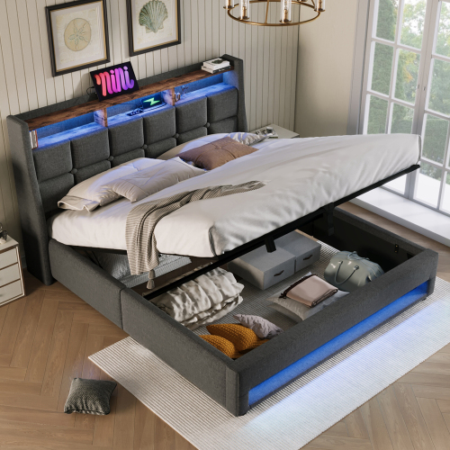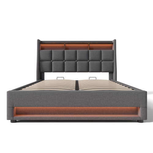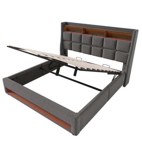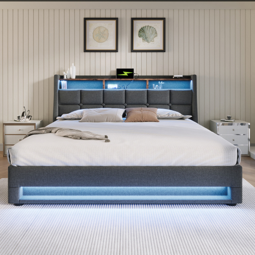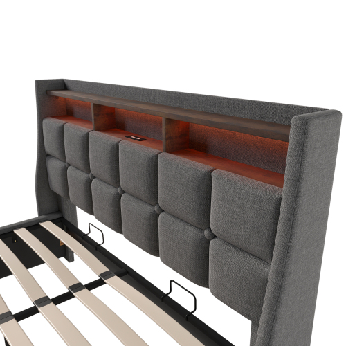 Product Name:Upholstered Double Bed 150 x 200 cm with LED Lighting, USB Type-C Charging Function, Storage Headboard, 5FT King Size Storage Bed Frame with Metal Slatted Frame, Linen, Grey (No Mattress)